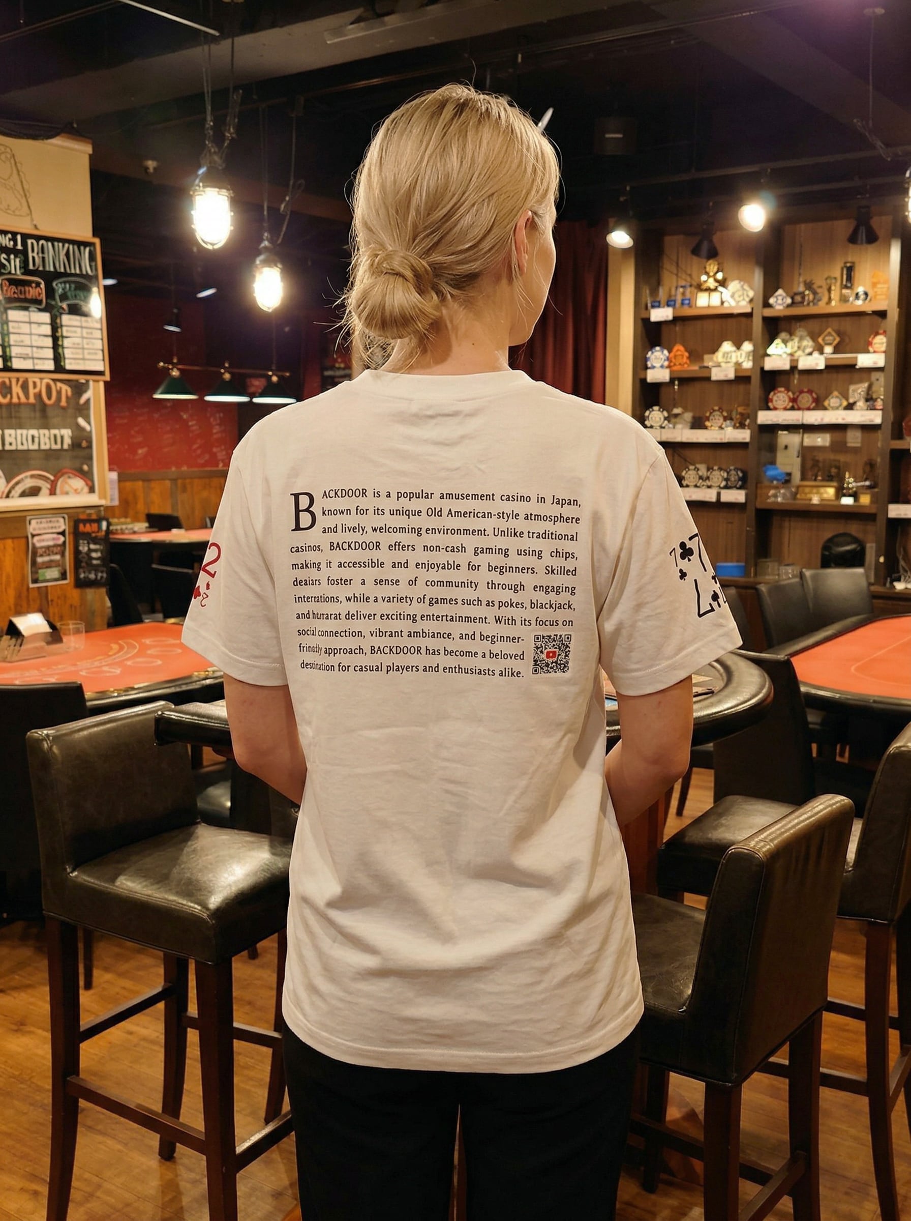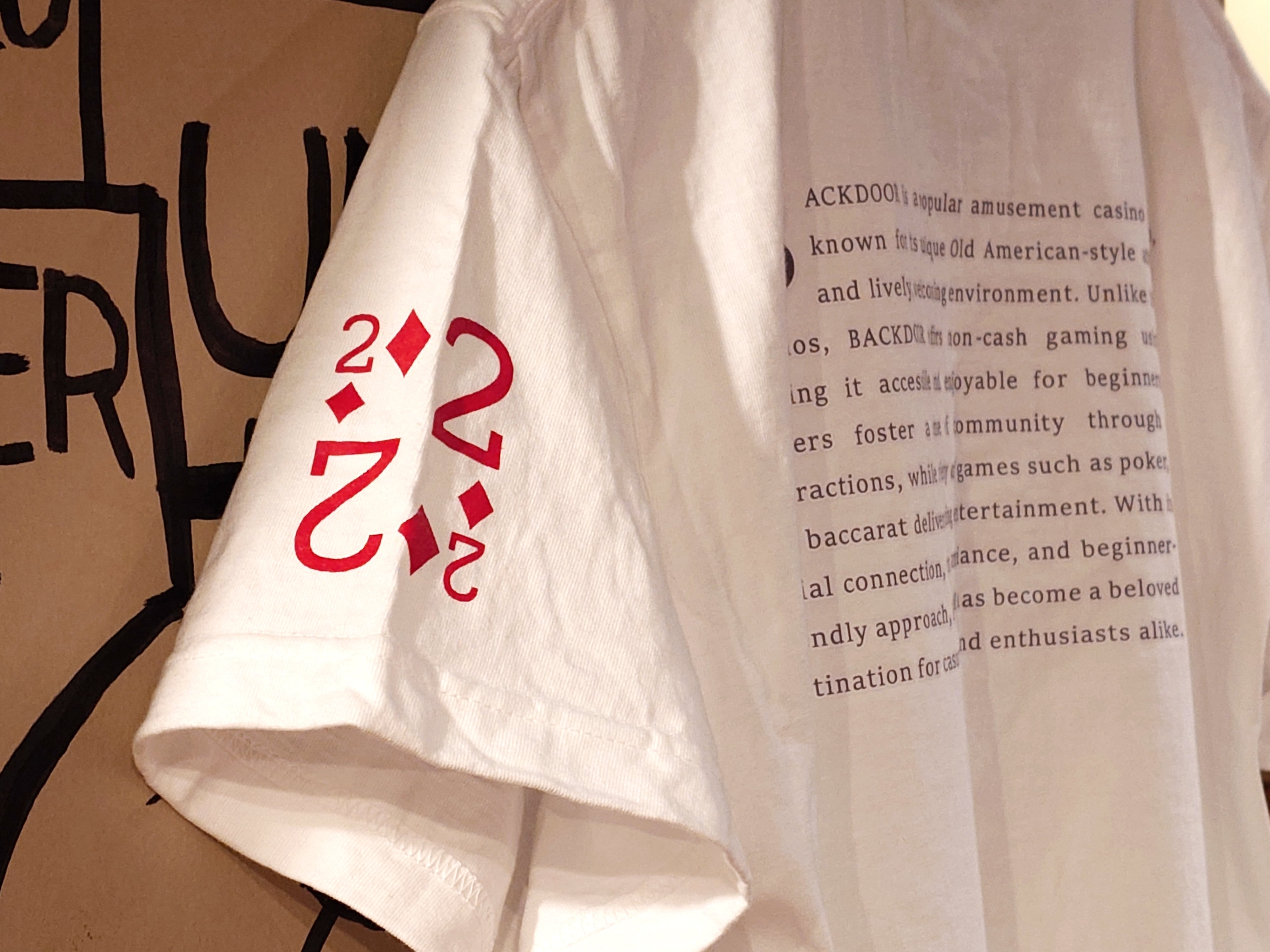 全国に店舗を展開するアミューズメントカジノ『BACKDOOR』から、待望のオリジナル半袖Tシャツが登場。胸元には印象的な“BACKDOOR”ロゴ、背面には当店の哲学を英語で綴ったステートメントと、その場で読み取れるYouTubeチャンネルのQRコードを配しました。左右の袖にはブランドを象徴する“2”“7”のナンバリング。イベント参戦はもちろん、タウンユースでも映える、存在感と着心地を両立した1枚です。